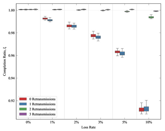 As was previously introduced in Section 5, IEEE 802.11 standard (WiFi) specifies a maximum number of retransmission attempts for any frame that is lost [35]. On the other hand, there could be IoT use cases where publishers would be connected through non WiFi wireless shared access medium, without any retransmission at all. In order to asses QUIC and TCP performance in such scenarios, and to decouple the results from the MAC layer operation, we used different maximum retry values (0, 1, 2 and 3) in the WiFi network, when studying the delay for traffic pattern A. The experiment was executed 50 times for each configuration (error rate and retransmission value). Each run entailed the transmission of 100 MQTT packets from the publisher to the subscriber. Figure 10 illustrates the resulting download completion ratio, showing how QUIC could reduce the latency over wireless shared access media. We can also see that this gain is less relevant when the number of retransmissions is larger. We can thus infer that, when this feature is enabled, it would be enough to cope with such eventual losses (especially if the loss rate is low), and the gain of QUIC is thus less relevant. In this sense, we can see the same behavior that was discussed earlier for Figure 7. When the loss perceived by the transport layer was 0%, the performance of TCP was slightly better than that shown for QUIC (). When the link loss rate increased, and/or fewer MAC retries were used, the transport layer suffered losses, and QUIC thus yielded a lower delay than TCP.