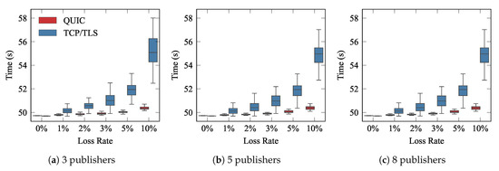 As mentioned earlier, Scenario B was proposed to emulate the case in which various edge-devices generate data, which is sent to the broker over a shared WiFi network. It is foreseen that the more publishers compete for a medium, the longer the overall communication delay will be. We evaluated QUIC and TCP performance with 3, 5, and 8 publishers, transmitting traffic pattern A, and we further assumed the subscriber was subscribed to the information provided by just one publisher. Figure 11 illustrates the completion times corresponding to the whole transmission of the information that the subscriber was expecting. We measured the parameter that was introduced in Figure 6a. As can be seen, QUIC clearly outperformed TCP/TLS in all cases, showing, in addition, more stable behavior, exhibiting less variability.
