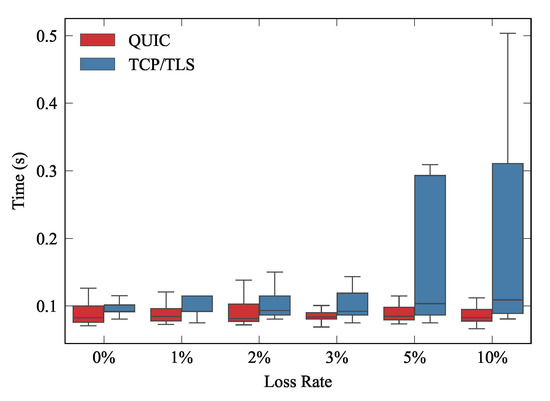 One of the main characteristics promoted by QUIC is the lightweight connection establishment. In order to analyze this improvement compared with the traditional TCP/TLS scheme, we used traffic pattern B, as depicted in Figure 6b.