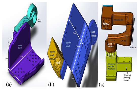 The individual parts were assembled as shown in Figure 2a and mounted on a wheelchair, as shown in Figure 2b. The exoskeleton was manufactured with fusion deposition modeling using the RAISE3D Pro2 Plus printer using NylonX, a 20% carbon-fiber filled nylon material and PLA. The overall weight of the printed wheelchair-mounted upper limb robotic exoskeleton with hardware is less than 6.61 lb, and it was easily mounted on the back of the powered wheelchair using two screws and did not restrict the movement of the powered wheelchair through regular-sized doors.The printed robotic exoskeleton with motors and sensors mounted to a powered wheelchair is shown in Results Section 3.2.