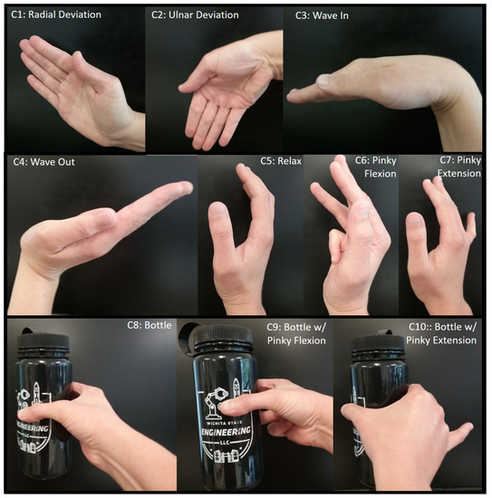 A grasp taxonomy of 33 grasp types was identified, with top-level divisions focused on whether the grasp required more power—that is, “all movements of the object have to be evoked by the arm”—or precision, followed by the opposition type or direction of force needed to grasp the object in reference to the palm, namely palm (perpendicular), side (transverse), or pad (parallel) [19]. Interestingly, only for 4 of the 12 precision categories did grasping involve the pinky finger at all, while 2 of the 6 intermediate categories (between precision and power) used the pinky finger. The pinky finger seemed to be more necessary for power grasping, as it appeared to be used in 12 of the 15 grasp schemes shown in the GRASP taxonomy [19]. Hence, it could be concluded that the pinky finger may not be necessary for grasping the majority of the time. Thus, it is proposed that the pinky finger could be flexed and extended while grasping an object, so flexion and extension of the pinky finger were ultimately chosen as the other two hand gestures to control the robotic exoskeleton. This made it possible to have seven different classes of movement in total. Three more redundant classes were also added, making a total of 10 classes, but still with 7 movements, in order to help with pick and place tasks, such as the water bottle pick and place task of this research project. The three additional classes were holding a water bottle as an additional rest position, holding a water bottle while flexing the pinky finger, and holding a water bottle while extending the pinky finger backward. An illustration of the gestures for EMG is shown in Figure 3, with class labels (C1–C10) and gesture names (e.g., radial deviation) labeled on each gesture image. Feature extraction included the use of the RMS, median filter, and mean. Raw sEMG signals were processed through these features, followed by a normalization prior to artificial neural network classification.