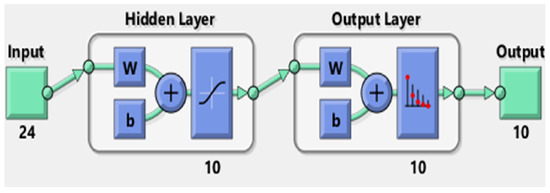 The number 24 under the input block represents the 24 features used in this study, and the number 10 under the output block represents the 10 classes; hence, an input vector of length 24 is expected, as is an output vector of length 10. The figure is a basic representation of the 10 hidden layer neural network that was used for testing, with the W block representing an S by R weight matrix, with S referring to the neuron count in that layer and R representing the input vector elements count and the b block representing the bias vector of length S [20].