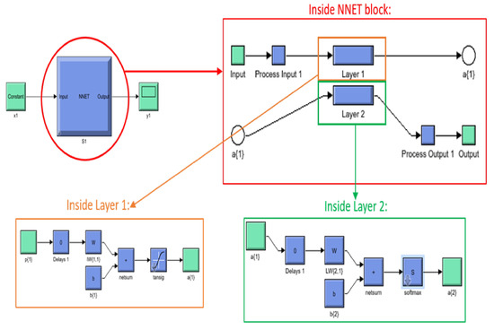 A trained scaled conjugate backpropagation neural network block with two layers (not to be confused with hidden layers)—one containing netsum and tansig functions and the other containing netsum and softmax functions—was generated. The netsum function is a summing function, while the tansig function is a transfer function, as shown in Equation (1), which calculates the hyperbolic tangent and fits the results between −1 and 1 [21].