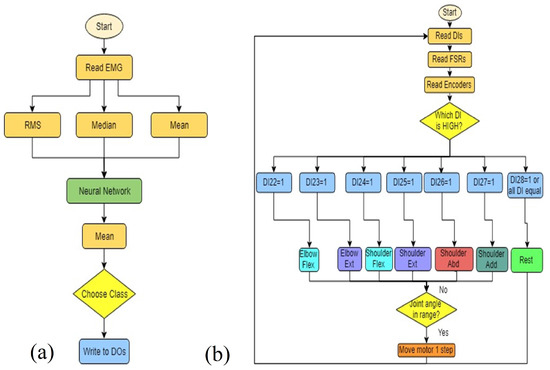 Algorithm flow chart for (a) Simulink Myo armband hand gesture recognition and (b) Arduino software controller for exoskeleton joints.