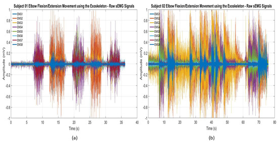 Raw sEMG signals recorded during the elbow flexion/extension movements of the exoskeleton: (a) subject 01 and (b) subject 02.
