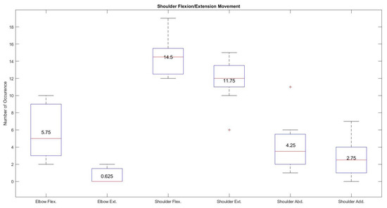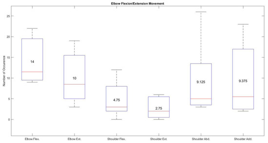 Each participant’s trained artificial neural network was implemented into the controller unit to identify the number of occurrences for each joint while controlling each individual joint at a time, mimicking the natural movement of the arm. For example, if a user only used specific gestures to control elbow flexion/extension movement, there is a possibility that the user could perform other gestures associated with shoulder flexion/extension or shoulder abduction/adduction movements. Figure 9 demonstrates the number of occurrences of all three exoskeleton joints during the elbow flexion/extension movement. The highest median and mean values recorded for elbow flexion and extension were 11.5 and 14 and 8.5 and 10, respectively. These values are higher than the median and mean values of shoulder flexion (3 and 4.75) and extension (2 and 2.75) and shoulder horizontal abduction (5 and 9.125) and adduction (5.5 and 9.375) readings. This type of adaptability not only improves user acceptance but also allows more than one degree of freedom to mimic the natural movement of the arm. Average elbow flexion was recorded at 30%, while average elbow extension was 20%, yielding a combined total of 50% for the elbow flexion or extension movements.