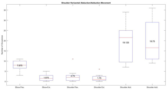 Shoulder horizontal abduction/adduction movement of the exoskeleton was often mistaken by the neural network during the individual testing of the joint. Figure 11 shows higher occurrences in terms of median and mean values (21.5 and 19.125 for shoulder horizontal abduction and 16.5 and 19.75 shoulder horizontal adduction) during the shoulder horizontal abduction/adduction movement using the associated gestures (pinky finger flexion/extension). Despite having a higher occurrence rate using pinky finger movements for shoulder horizontal abduction and adduction movements, quick changes in hand gesture classification were observed where elbow flexion/extension movement falsely identified by the trained artificial neural network due to the use of the pinky finger in radial and ulnar deviations.