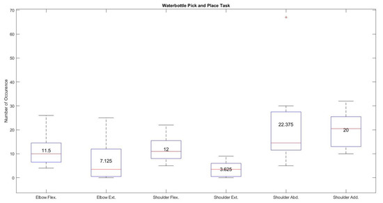 Figure 12 shows the number of occurrences in terms of median and mean values for each joint of the exoskeleton during a water bottle pick and place task. The median and mean values of shoulder horizontal abduction and adduction were 14.5 and 22.375 and 20.5 and 20, respectively. These values, compared with scores of 10 and 11.5 for elbow flexion, 3.5 and 7.125 for elbow extension, 11 and 12 for shoulder flexion, and 3.5 and 3.625 for shoulder extension, demonstrates the higher use of shoulder horizontal abduction and adduction during a water bottle pick and place task compared with the almost equally utilized elbow and shoulder flexion and extension movements.