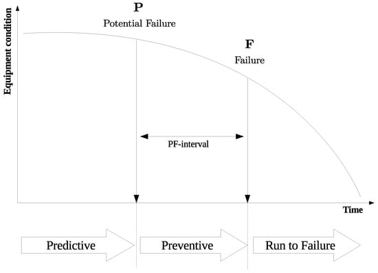 An equipment failure is almost random and unpredictable which is impacted by several (unknown) factors. A well-known technique to decide on the maintenance approach is P-F curve analysis (cf. Figure 1), which allows understanding the condition of equipment over time [8]. During the time between the detection of potential failure and the actual failure, it is crucial to perform a maintenance action to address the problem before a functional failure occurs.