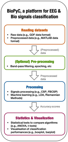 We developed and tested BioPyC, an open-source and easy-to-use software for offline EEG and physiological signal processing and classification. BioPyC is free of charge, permissively licensed AGPL ( https://choosealicense.com/licenses/agpl-3.0/; accessed on 25 August 2021) and written in Python [12], an open-source programming language that is not only backed by an extensive standard library, but also by vast additional scientific computing libraries. This toolbox allows users to make offline EEG and biosignals analyses, i.e., to apply signal processing and classification algorithms to neurophysiological signals, such as EEG, electrocardiographic (ECG) signals, EDA or respiratory signal. See https://gitlab.inria.fr/biopyc/BioPyC/; accessed on 25 August 2021. In order to facilitate those analyses, BioPyC offers a graphical user interface (GUI) based on Jupyter [13] that allows users to handle the toolbox without any prior knowledge in computer science or machine learning. Finally, with BioPyC, users can apply and study algorithms for the main steps of biosignals analysis, i.e., pre-processing, signal processing, classification, statistical analysis and data visualization, as Figure 1 summarizes.