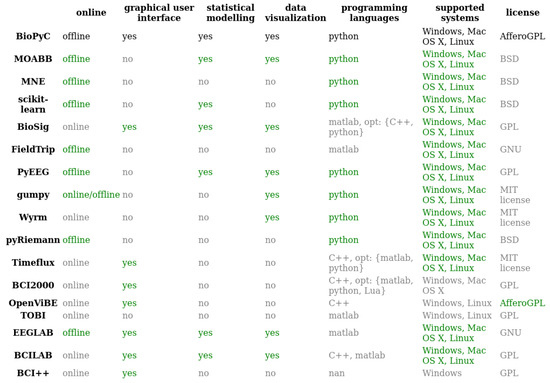 So far, several platforms for online experiments (i.e., BioSig [17], Timeflux [18], BCI2000 [19], OpenViBE [20], TOBI [21], BCILab [22] or BCI++ [23]) and also for offline studies (i.e., MOABB, MNE, EEGLAB [24], PyEEG) and finally for both online and offline studies (i.e., FieldTrip [25], Gumpy [26]) have been developed for researchers in order to build setups that would best suit their needs. They all have modules dedicated to the various BCI processing steps: data acquisition, signal processing, classification, statistical hypothesis testing and visualization [27]. We synthesized in Figure 2 the features of each of these existing platforms, i.e., online vs. offline studies, the availability of a graphical user interface (GUI), the existence of modules for statistical testing or data visualization, the programming language, and the supported systems as well as the type of license, in order to list the strengths and weaknesses of each one. Note that we presented both EEGLAB, which is made for EEG signals analysis, and the BCILAB toolbox, which is a plugin of EEGLAB made for online and offline classification and BCI, in this table. In the following, we compare the different platforms based on each of these features.