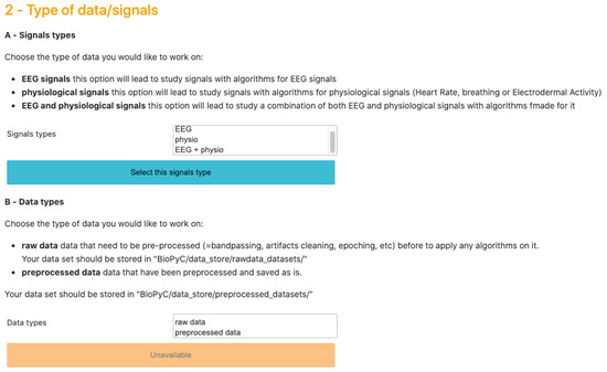 Screenshot of BioPyC’s widgets, i.e., “select multiples” and buttons at the step of selecting the type of data/signals to work on. In BioPyC, a blue button stands for the action to make, when the disabled orange ones stand for future actions to make: orange buttons turn blue when the previous action is done.