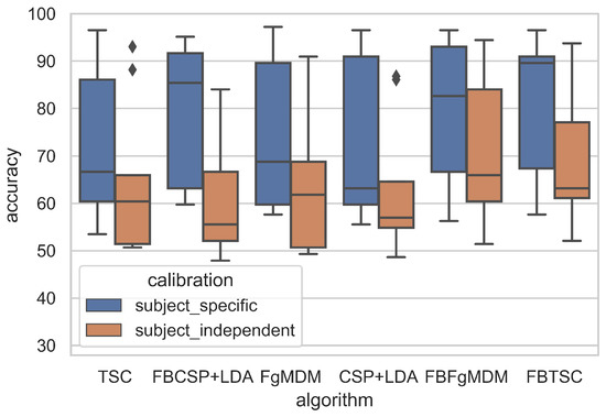Although promising, non-invasive BCIs are still barely used outside laboratories, due to their poor robustness with respect to noise and environmental conditions. In other words, they are sensitive to noise, outliers and the non-stationarity of electroencephalographic (EEG) signals [6,7]. While considering and optimizing user training is essential for improving such systems [8,9], the computing machinery considerably evolved in the last decades, and numerous signal processing and machine learning algorithms for brain signals classification have also been developed [10]. It is, therefore, important to be able to test many promising new algorithms, resulting from both signal processing and machine learning research, on different data sets related to different paradigms in order to identify the most efficient tools for their future uses. This type of study can be complicated to set up online because of the costs in terms of time, e.g., equipping a subject with different sensors to measure the activity in order to analyze it online, or in terms of calculation, given that some algorithms, such as deep learning, may require a lot of computing resources and would be difficult to run online. However, such studies are possible offline, by applying recent and promising classification algorithms on existing data sets, and are actually widely used in the BCI community, notably to compare various algorithms on the exact same data [11]. While offline studies are simpler to set up than online analyses, they still require specific tools and skills to be run effectively and efficiently. Indeed, using such algorithms requires expertise in programming (e.g., in MATLAB or Python), signal processing, machine learning, as well as statistics for analyzing the resulting performances of the different algorithms; however, many BCI researchers come from diverse backgrounds, such as cognitive science, neuroscience or psychology, and might not master all those skills. If multiple BCI toolboxes are already available, they all require such skills, and most of them are focused on EEG and other brain signals, but usually do not include processing tools for other biosignals. It therefore highlights the need for convenient toolboxes that would be free, open source and equipped with a graphical interface that would allow users to process and classify EEG and other biological signals offline without any programming skills.
