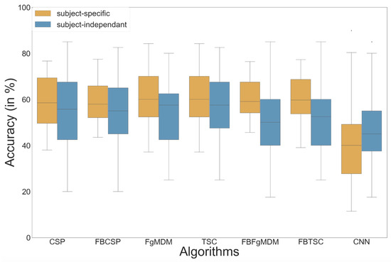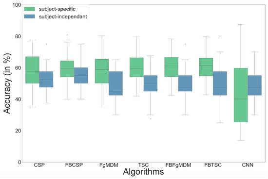Regarding the third step of the BCI process—i.e., signal processing and machine learning for EEG signals classification—so far, BioPyc proposes several efficient algorithms for decoding oscillatory activity: the CSP [30] and FBCSP [16] for spatial filtering, and the LDA, Riemannian geometry methods [31,39], as well as the CNN [40] as machine learning algorithms implemented in BioPyC. However, the ongoing works aim to integrate new signal processing and machine learning algorithms for the classification of event related potentials (ERPs) into BioPyC. Among them, xDAWN [82], which is widely used for spatial filtering and has proved to be efficient for EEG-based classification of workload levels [83]. It would also be interesting to integrate other ERP spatial filtering methods into the future versions of BioPyC, e.g., principal component analysis (PCA) or canonical correlation approaches (CCA) [84] that proved efficient for EEG classification of mental workload levels as well [85]. Moreover, current works also aim at integrating machine learning methods for the classification of both ERPs and oscillatory activity with BioPyC, e.g., EEGNet [86]. Finally, the fourth and last step of the BCI process, i.e., performing visualization and statistical tests on classification performance results, also benefits from current improvements: a new module for visualizing the percentage of use of the different frequency bands selected by the filter bank-based algorithms, i.e., FBCSP, FBFgMDM and FBTSC, is now integrated but has not been used so far. Moreover, a module for analyzing which brain areas are used by the classifiers (i.e., which electrodes brought the most information) will be soon integrated into BioPyC.