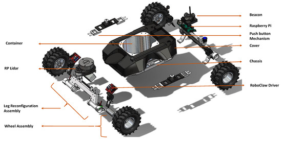 - Hayat, A.A.; Elangovan, K.; Rajesh Elara, M.; Teja, M.S. Tarantula: Design, Modeling, and Kinematic Identification of a Quadruped Wheeled Robot. Appl. Sci. 2019, 9, 94. [Google Scholar] [CrossRef] [Green Version]