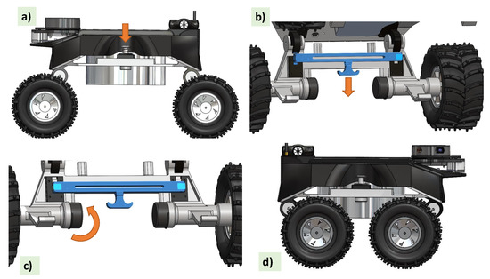Steps of the reconfiguration. (a) Push button pressing to open the provision to insert and hold the pin (b) Pulling the lock open when triggering the pull lever (c) Adjusting the wheel assemblies (d) New wheel assembly configuration