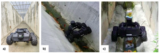 Adaptability of the robot to various drain scenarios. (a) In a drain with a flat floor (b) In a drain with a curved bottom (c) In a cut-off drain
