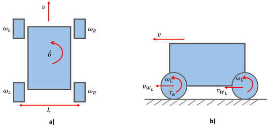 This section describes how high-level velocity commands are converted to low-level wheel angular velocities through the kinematic model. The free body diagram of Raptor representing the linear velocity, v, and angular velocity, , of the robot are shown in Figure 4. L represents the distance between the left and the right wheels, and and represent the linear velocities of the left and right wheels, respectively.