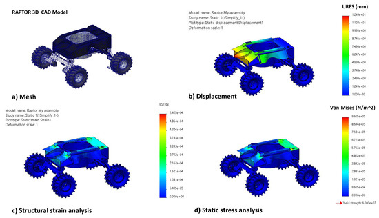 The structural load-bearing capacity of the platform is an essential factor for a rigid and robust platform design in-order for robust operation in the drain environment. It is identified that the critical scenario for failure is the head on collision of Raptor with the drain walls. This event could impose severe stress on the structure and could potentially break the weakest link. Hence, this scenario is simulated with Finite Element Analysis and cross-checked for maximum stress and strain of the structure. For this simulation, the CAD model was meshed with a tetrahedral mesh as shown in Figure 5. Boundary conditions were applied with fixed constraints on all the four wheels and a static load of 10N was applied on the front impact region of the vehicle. A static structural analysis was performed in order to analyse the structure based on displacements (refer to Figure 5b), maximum von-mises (refer to Figure 5c) stress and enduring strain (refer to Figure 5d).