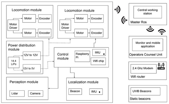 The electronics and control architecture of the robot are depicted in Figure 6. The locomotion module consists of four DC metal-gear motors (with 391:1 gear ratio and the dimension of 20D × 46L mm). Motor pairs on each side mounted to the chassis structure are controlled by separate motor drivers (RoboClaw) with separate addresses through the Universal Serial Bus (USB) protocol. This communication is to facilitate the four-wheel independent drive motor control, and the USB protocol allows us to publish data to motors and subscribe the feedback from encoders. The leg provision in the chassis provides a secure mounting for magnetic wheel encoders. The perception for Raptor is primarily through 2D Lidar (RPLidar A1M8) with the USB protocol. Lidar facilitates the mapping of the environmental situation and navigation in drains. A 4-cell Lithium-ion battery (14.4 V, 2800 mAh) is used to power the 5 V Single board computer (SBC) and 12 V motor drivers through respective voltage regulators. The remaining sensors are either powered through USB or Input/Output (I/O) circuit connections through the SBC. The SBC was chosen carefully based on multiple considerations. A RaspberryPi microprocessor with a clock speed of 1.2 GHz outperforms the Arduino microcontroller, which has a clock speed of 16 MHz. Furthermore, our application demands a microprocessor with inbuilt CPU processor, RAM, Graphics card, and connector pins. In addition to performing the high level ROS autonomy processing, RaspberryPi also enables direct communication with motor drivers and IMU through the USB and I/O communication protocols. Even though more powerful microprocessors like Jetson Nano, with its high graphical processing capabilities, easily overpowers RaspberryPi, a more optimised SBC solution must be chosen considering power consumption, cost and processing requirements. Since the data being processed is of moderate heaviness, RaspberryPi Model B is chosen as the appropriate SBC. A 435i RealSense camera unit is mounted to RaspberryPi, and the data are directly streamed to the ROS master unit on a high processing Personal computer (PC) with a Graphics Processing Unit (GPU) for the machine learning layer. RaspberryPi firmware is installed with Ubuntu 18.4. All the sensors, SBC, and the GUI control module are integrated through the ROS (Robot Operating System) framework. ROS operates with all the sensors (slave node) and SBC (master node) acting as nodes communicating through ROS topics with customized message formats.