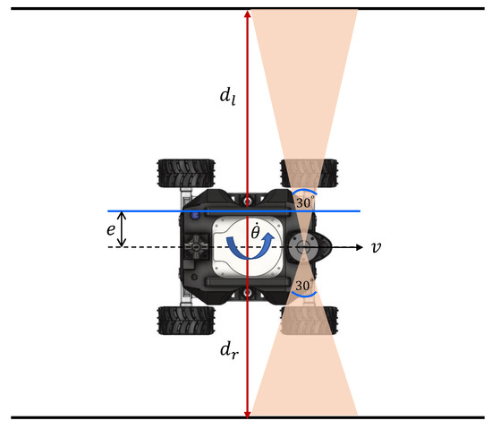 In test scenario ‘a’, the robot was placed in the drain with no heading error or offset from the middle, as shown in Figure 12a. Then, the navigation of the robot was initiated. The corresponding variations of the inputs and output of the controller in this scenario are given in Figure 13a. According to the plots, the error of the robot, e, and a few oscillations of e could be noted. However, the magnitude of the oscillations was trivial, leading to a small Root Mean Squared Error (RMSE) (RMSE = 3.8 cm). Thus, the performance of the controller was acceptable in this scenario. The traced path of the robot in this scenario is shown in Figure 14a. This path also confirms that the robot was properly moved in the middle of the drain.