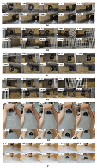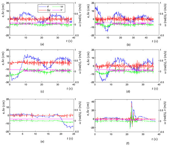 Due to the rough nature of the drain walls, the range sensor information could include noises. The high-frequency variations of e observed in the plots are due to the noises. Especially, very large sudden variations of e could be observed in test scenario ‘f’ between 21–25 s even though the robot moved in the middle (robot’s movement in the middle without such variations can be confirmed from the map shown in Figure 14f). These variations were due to the sensor noises caused by uncertain characteristics of the side walls such as vertical slants, reflections, unevenness and impurities. Even though the proposed controller experienced imprecise input information from the sensors, the controller was capable of adequately navigating the robot in the middle of the drain. These observations confirm the sensor uncertainty handling ability of the proposed controller.