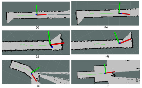 Traced path of the robot during the test scenarios. (a) Scenario ‘a’, (b) Scenario ‘b’, (c) Scenario ‘c’, (d) Scenario ‘d’, (e) Scenario ‘e’, and (f) Scenario ‘f’.