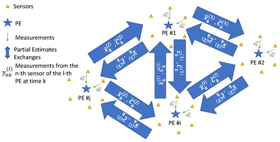 At the end of the updating interval, each PE has an estimate of the state vector. The PEs exchange their partial estimates in order to fuse the information, i.e., reach a consensus on the state of the system. The final estimate of the state of the system at time k is