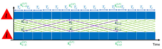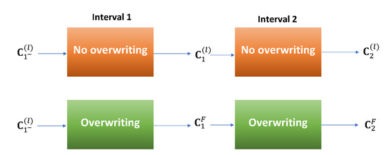 Starting with the same and as the input to both methods, the output covariance of the overwriting method is , while the output without overwriting is for . Figure 2 depicts the first two intervals. Because the fusion method is proper, we have that for all ℓ. These values are the inputs to the second interval. Because the estimation method is plain, for all . These, in turn, are the inputs to the next interval and so on. Please note that since all the methods here are unbiased, it is sufficient to compare only the covariance matrices and not the actual estimates. With the same line of reasoning, it can be easily shown that the same conclusion holds for the other intervals. Therefore, for all k and the proof is complete. □