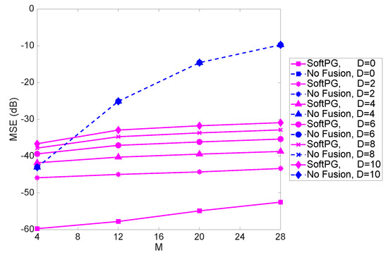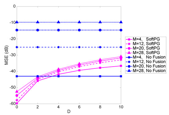 Figure 5 shows the MSE as a function of the size of the state vector, M, for different values of delay. For higher values of M, the difference between the performance of the SoftPG and the No Fusion benchmark increases. Moreover, one can conclude that with fusion there is less sensitivity to M.