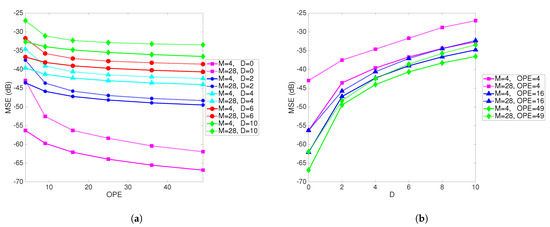 (a) MSE as a function of the number of observations per PE (OPE) for different M and different delays. Number of PEs is fixed at 9. (b) MSE as a function of delay for different M and the number of observations per PE. Number of PEs is fixed at 9.