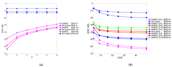 In Figure 7a the performance of the system is illustrated as a function of the delay for varying number of observations per PE. Clearly, the difference between the performance of the SoftPG method and the No Fusion benchmark is quite large. Figure 7b shows the MSE as a function of the number of observations per PE per iteration for two numbers of PEs. As expected, for a specific number of observations per PE, by increasing the number of PEs, the performance improves.