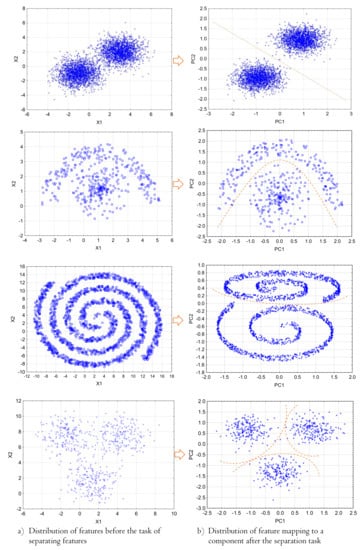 Figure 2 shows the principle of assigning features to one of the two components according to Equation (3) for a linear and nonlinear separation space.