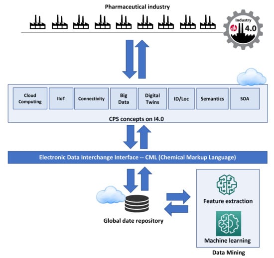 The basic assumption of the model is that each pharmaceutical company implements the Industry 4.0 strategy in the production of drugs and uses one or many of the different concepts of horizontal communication, i.e., Cloud Computing [44], IIoT [45], Connectivity [46], Big Data [47], Digital Twins [48], ID/Loc [46,49], Semantics [50,51], SOA [52]. Of course, we can assume other solutions, but the eight mentioned are key concepts of the CPS I4.0. The model proposes that the data exchange should take place using the CML (Chemical Markup Language) standard. Information about the values of the measured characteristics is stored in the main common repository. Then, the collected data are used by the Data Mining module, which also extracts features apart from classification. Each enterprise uses a common data repository and machine learning mechanisms. In this way, by sending data for classification in real time, the company receives a response within a certain time. This time is an important element of research. Because it determines the speed of reaction to the dynamically changing risk of chemical hazards.
