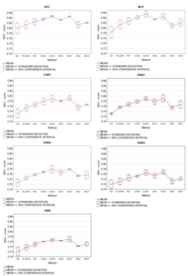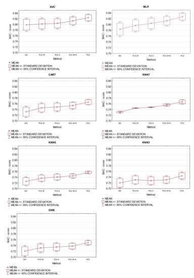 For the classification task, the KNN classifier was used with 3, 5, and 7 nearest neighbors. The best results for MLP were obtained with 7 hidden layers, linear activation function, alpha parameter set to 0.01 and momentum of 0.6. For K-NN, the best result was achieved using Euclidean distance and 7 nearest neighbors. For SVC, the best balanced accuracy score was acquired for C = 0.1, rbf kernel and gamma parameter set to auto. For decisions trees CART, the best classification quality was obtained with criterion gini, splitter: best and maximum depth of 7. The best classification results were applied in all experiments.