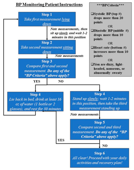 Measurements: Patients were provided with a BodyTrace BP/HR monitor in the Post-Anesthesia Care Unit (PACU), linked to a web-based clinical portal (IGetBetter, Inc., Framingham, MA, USA) for real-time data capture. A member of the research team provided detailed written and verbal instructions during the enrollment process and again in PACU prior to discharge, including a flow diagram guiding the patient through each measurement (Figure 1).
