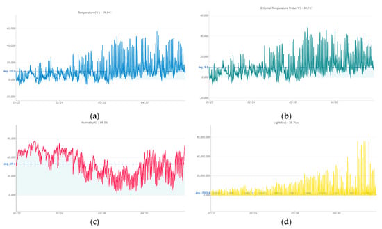 Graphical interpretation of the weather condition of the rail S49 (49E1): (a) temperature inside the crown of the rail, (b) ambient temperature, (c) humidity, (d) ambient light.