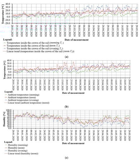 During the tests, the Tszyn WS1 WIFI measurement station recorded data on ambient temperature, temperature inside the rail head, humidity and ambient light. Measurements were conducted from 21 January 2020 to 29 May 2020 with an hourly data recording cycle (Figure 5). A total of 5002 data points were collected from which observations made in the morning (7 a.m.), afternoon (1 p.m.) and evening (7 p.m.), respectively, were selected. This filtering of the data provided a set of observations for the same measurement epoch on each measurement day. The resulting data were used for further analysis.