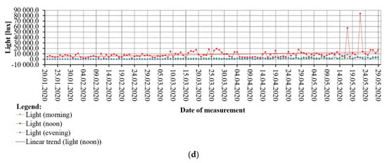 Graphical interpretation of the obtained measurement results using Tszyn WS1 WIFI measurement station: (a) ambient temperature; (b) temperature inside the rail head; (c) humidity; (d) ambient lighting.
