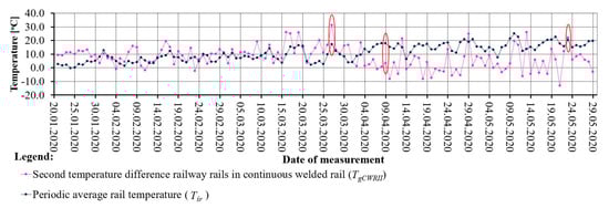 Analysis of TgCWRII and Tśr values provides a quantitative estimate of the stress change over the measurement epochs. The average value of the rail temperature Tśr during the measurement period indicates the average thermal stress values in the rail. In cases of the simultaneous occurrence of high or low values of the periodic average temperature Tśr and a close to zero value of the indicator of the second temperature difference TgCWRII, there is a probability of failure (e.g., 9 April 2020). On the other hand, when the second temperature difference indicator TgCWRII reaches values far from zero (significant temperature fluctuations) and the periodic average temperature Tśr is low, the probability of failure is also high (e.g., 27 March 2020). The worst condition for the rail operation is a situation in which the values of the second temperature difference indicator TgCWRII and the value of the periodic average temperature value Tśr are far from zero (e.g., 23 May 2020). The adverse effects of other impacts that may further compound the effects of temperature changes (e.g., operational impacts) are also considered.