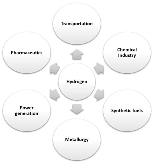 Hydrogen is a current topic for the world of science. Due to its energy potential, it is becoming the source of a new generation of fuel. It is a renewable, clean, environmentally friendly and highly efficient source of energy [1,2,3,4]. Many current environmental problems are intended to be reduced by replacing fossil fuels with energy generated by hydrogen [2,3,4,5,6]. Until now, hydrogen has been used as a rocket fuel in aerospace programs [4,7]. BMW, Honda, Toyota and Hyundai have already introduced hydrogen-powered vehicles based on hydrogen fuel cells on the market [4,8]. Other industries in which hydrogen is used because of its reducing properties are the chemical industry, aerospace engineering, pharmaceutics, metal reduction, petroleum extraction and in synthetic fuels [8,9,10,11,12] (Figure 1). Thus, its increasingly frequent utilization in various areas leads to the need to ensure safety during use.