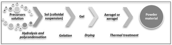 The sol-gel synthesis method is an unconventional synthesis route, known for the possibility of controlling the final characteristics of materials. It allows the control both from the compositional and morphological point of view by varying the synthesis conditions [76,77,78].