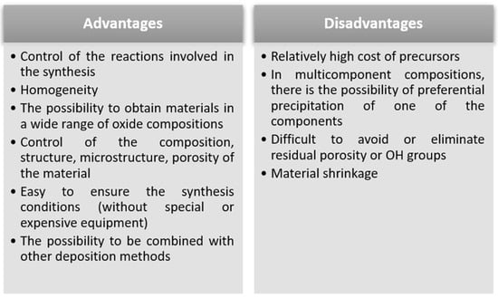 Figure 3 shows the advantages and disadvantages of the sol-gel synthesis method [70,80,82]. Whatever the sol-gel synthesis option chosen, among the advantages of this method are: control of the reactions involved in the synthesis and obtaining materials with homogeneity, even in systems with a large number of components [83,84]. Another very important advantage of this method is that it does not involve special conditions for synthesis, such as ensuring a certain pressure or a certain type of atmosphere [70,80,82].