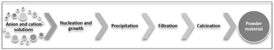 The method involves the precipitation of metal cations in the form of hydroxides, carbonates, citrates or oxalates. The final powder is obtained following a heat treatment of calcination [90,91]. The conditions of the heat treatment depend on the type of the material synthesized. However, due to the fact that the heat treatment of calcination does not generally require very high temperatures, the formation of particles with small dimensions is favored [91].