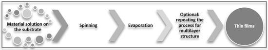 Among the most commonly used methods for synthesizing thin films is spin coating. It is a method that allows the production of uniform thin films, with thicknesses of the order of micrometers and nanometers, on flat-shaped substrates [100,101]. It allows the deposition of both organic and inorganic materials [102,103]. This method uses centrifugal force to evenly spread the material solution over the entire surface of the substrate [104].