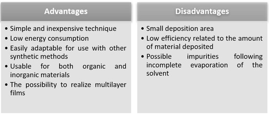 Figure 9 highlights the advantages and disadvantages of this deposition method. It is worth mentioning as an important advantage that it is a simple and inexpensive method, which leads to obtaining thin and uniform films. An important disadvantage is given by the low efficiency of the amount of material deposited. About 95–98% of the material is flung off of the substrate during spin process, with only about 2–5% of the amount of material remaining on the substrate [104,107].