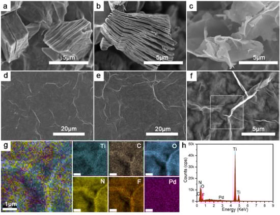 SEM and EDX images of the material surface morphology. (a) SEM image of bulk Ti3AlC2; (b) morphology of the commercial Ti3C2Tx; (c) SEM image of d-Ti3C2Tx after intercalation; (d) morphology of/d-Ti3C2Tx film; (e–h) Pd (II)@alkyne-PVA/d-Ti3C2Tx film surfaces morphology, element mapping (1 µm scale bar), and EDX spectrum [109].