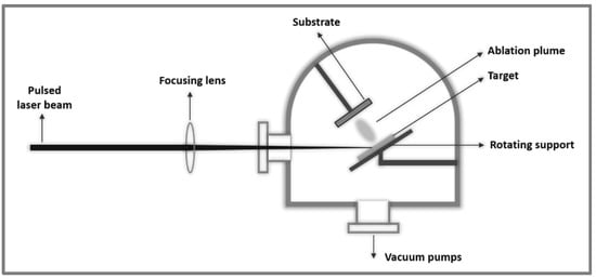 The principle of operation of a PLD installation is described in Figure 12. A high-energy laser beam irradiates the surface of the target material, where the laser energy is transferred as electronic excitation, and subsequently transformed into thermal, chemical and mechanical energy, which leads to ablation. As a result of ablation, a plasma is formed with species from the target material (electrons, ions, atoms and molecules). It reaches the substrate positioned in front of the target; the substrate has the possibility to be heated and/or rotated, thus favoring the growth of the film and covering of the entire substrate [116,117,118,119].