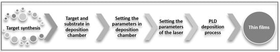 A synthesis flow for the PLD method can be considered (Figure 14) that starts from the synthesis of the target material by different methods. The obtained target is located inside the PLD deposition chamber, which ensures the atmosphere required for the deposition: the gas in which the deposition is made and its pressure. After the substrate is placed at a certain distance from the target, the parameters of the laser are fixed. During deposition, the position of the laser beam on the target is continuously changed in order to avoid target erosion, and deposition of the thin film onto the substrate is obtained.