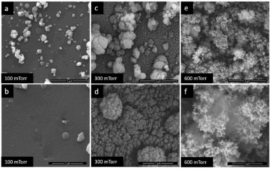 SEM images of TiO2 films at (a,b)—100 mTorr, (c,d)—300 mTorr, (e,f)—600 mTorr [122].